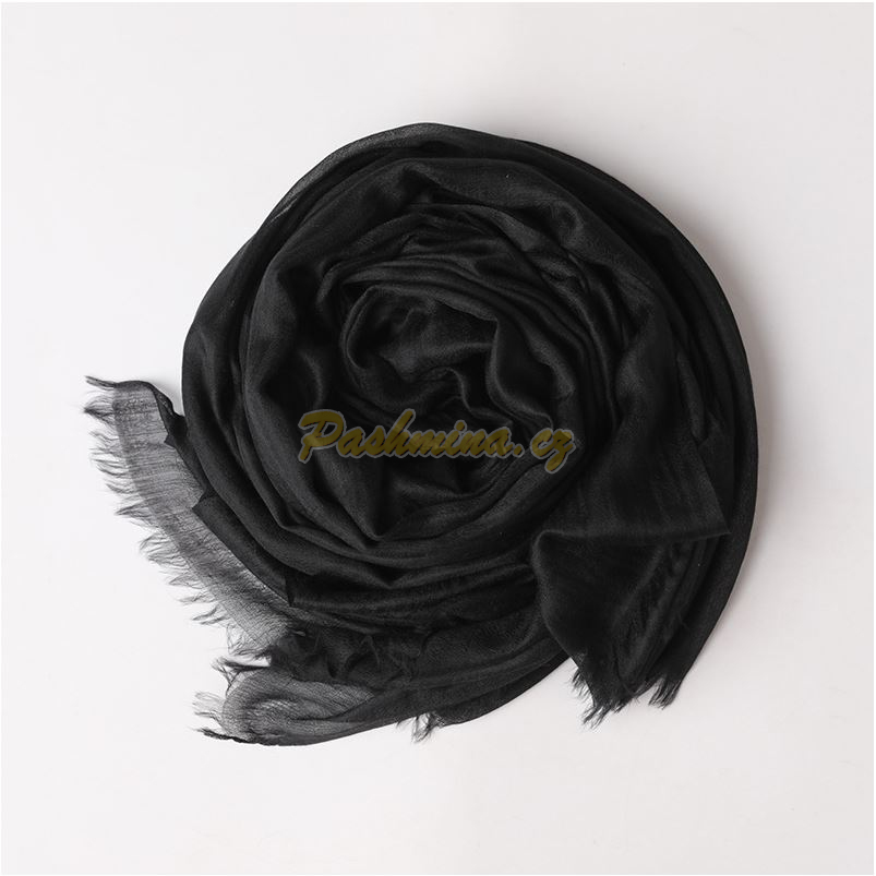 Příjemný a hebounký velký šál z čistého kašmíru. Pavučinka 200 yarn, lehounká (50 g) a transparentní. S malými hebkými třásněmi typu "oční řasy" na kratších koncích.