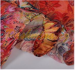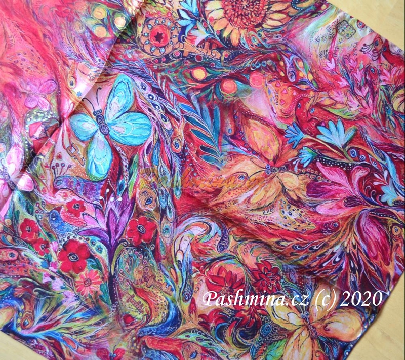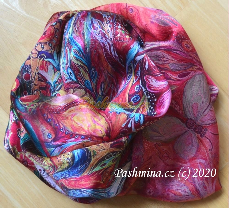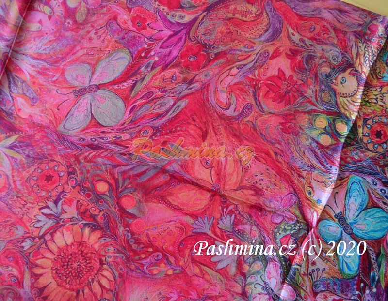 Krep satén hladký, ručně zpracované okraje. Krásný vzor v krásných sytých barvách. Převážně růžové a červené, doplněných hlavně tyrkysovou a žlutou. Květiny, motýli, sem tam skrytý ptáček. Na středu je motiv jakoby zamlžený, rozpitý. Na krajích je ostrý a jasný, evokuje ilustraci v knize.
