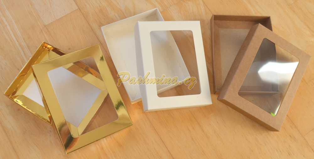 Menší krabička z pozlaceného papíru s průhledným okénkem. Zboží uvnitř bude proloženo hedvábným papírem ve zlaté barvě. Ze stran bude krabička zajištěna průhlednými odlepitelnými přelepkami. Stačí již jen doplnit mašličkou, ale i bez ní je balení hezké.