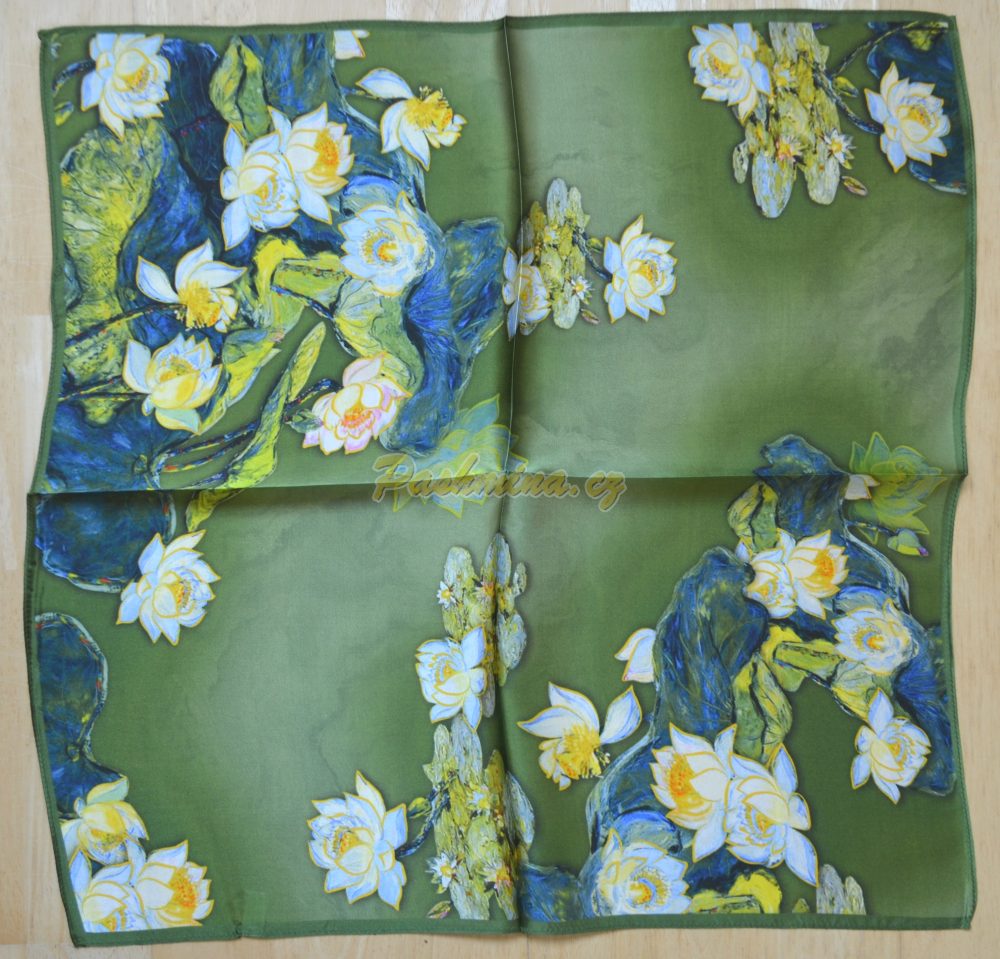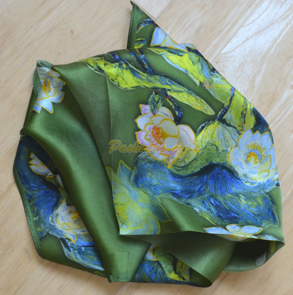 Příjemný šáteček z jemného, čistě hedvábného hladkého krepsaténu. Morušové hedvábí síly 12 m/m o váze pouhých 30 g. Tištěný vzor a okraje začištěné strojem.