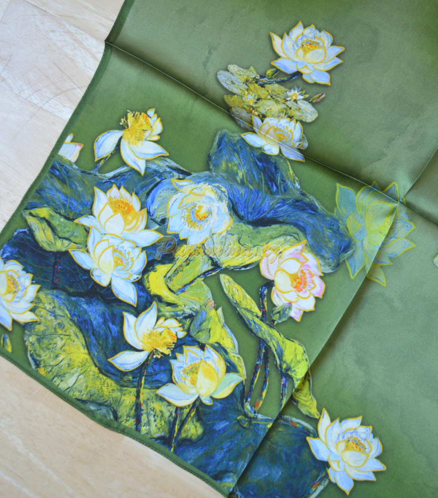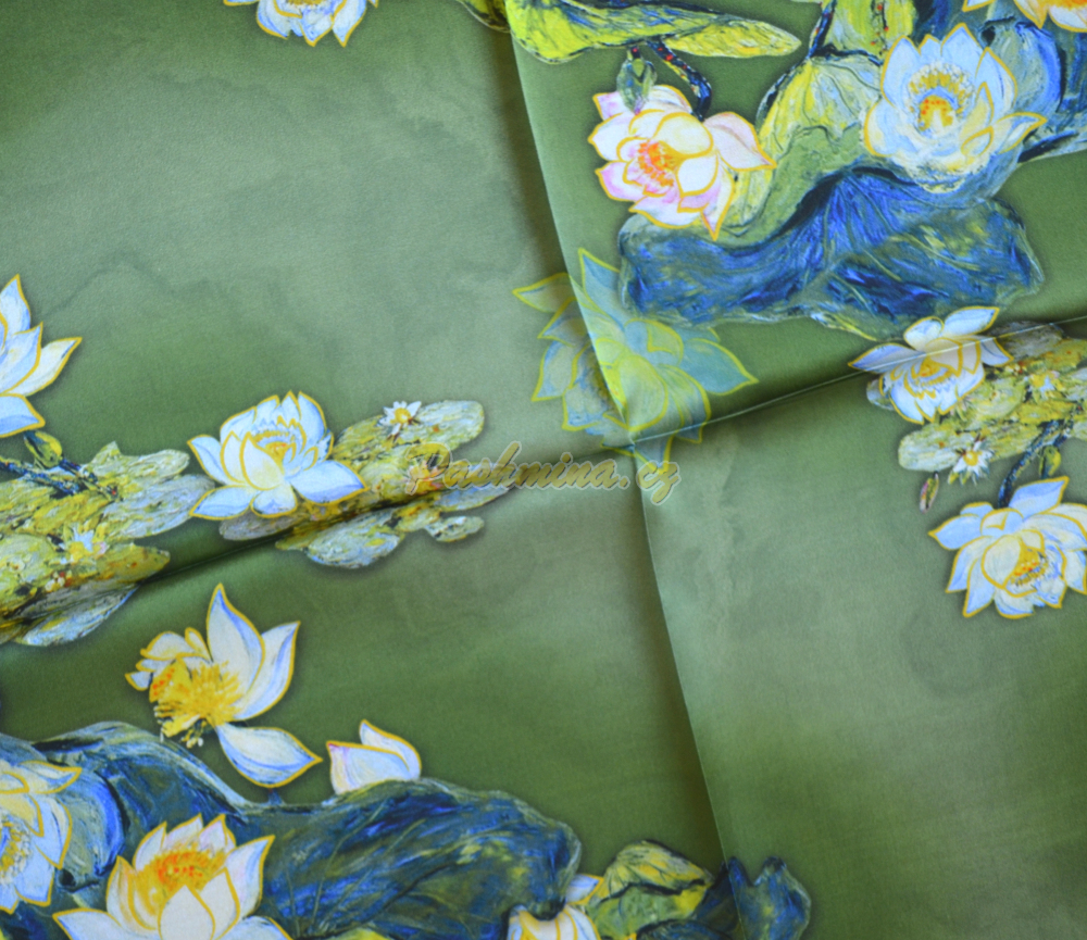 Na tlumené, téměř khaki zelené, plují krémové lekníny. Barvy leknínů jsou žlutavá, růžová a světle modrá, středy jsou žluté s oranžovými pestíky. Listy barevně přechází od žluté, přes zelenou až k šedomodré.