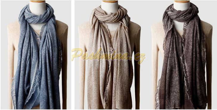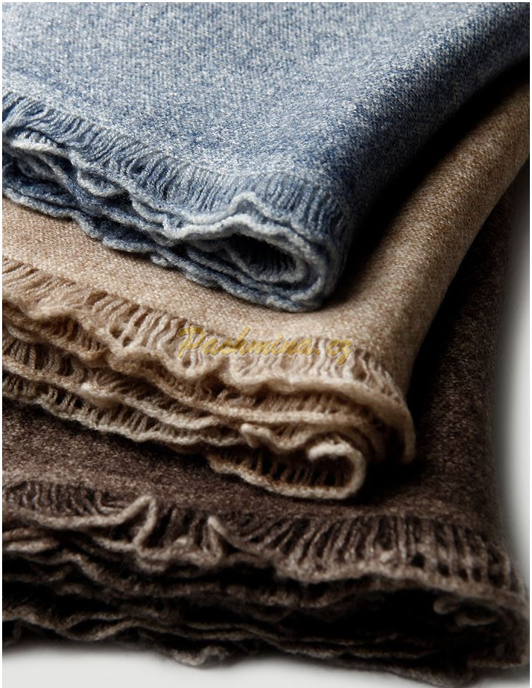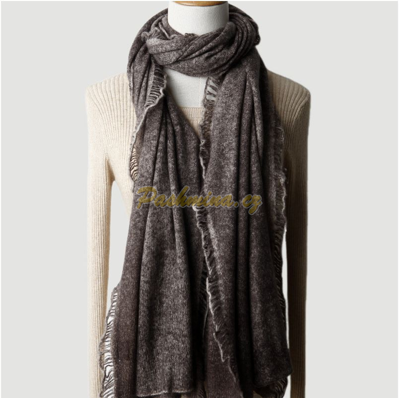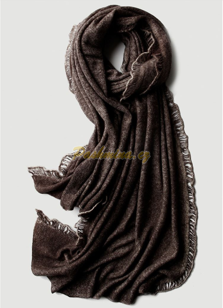 Větší luxusní šál z čistého kašmíru. Melírovaný, tmavě hnědý, s lehkým barevným přechodem. Měkký, středně silný a lehounký pletený šál s originálně zpracovaným krajem. Netradičně jsou kratší kraje jen hladké a zdobené jsou obě delší strany. Efekt krajkového, lehce zvlněného kraje je vytvořen 2 cm vlákny zaháčkovanými do řetízkového kraje. Šál, vhodný spíše na podzim a zimu. Váha 160 g.
