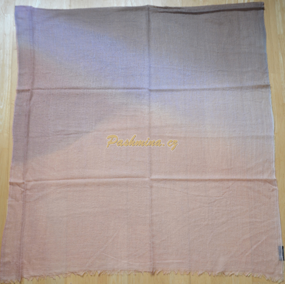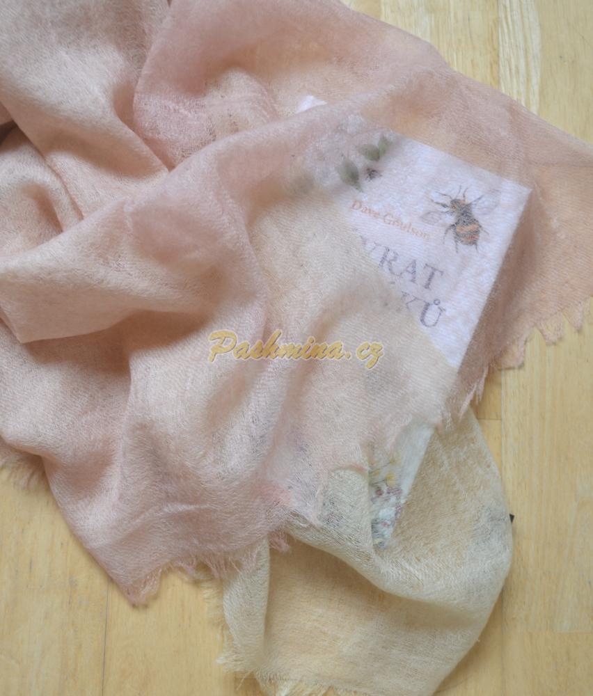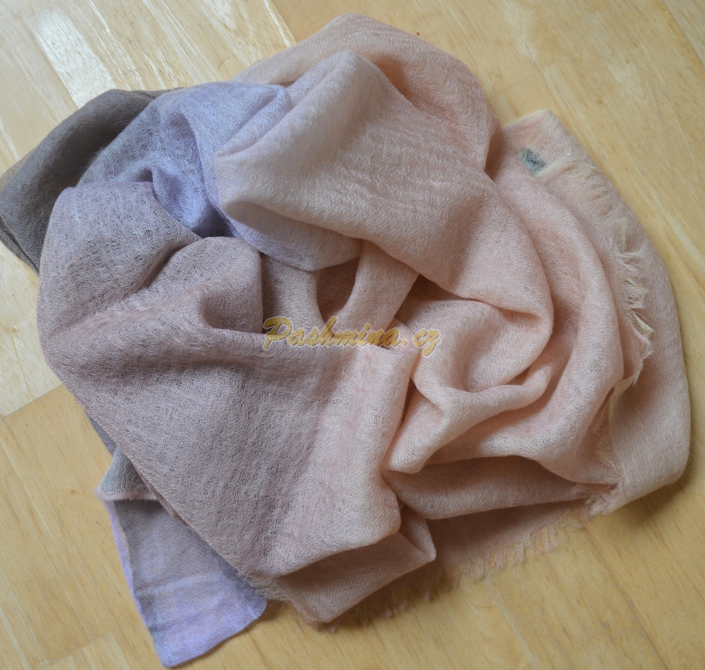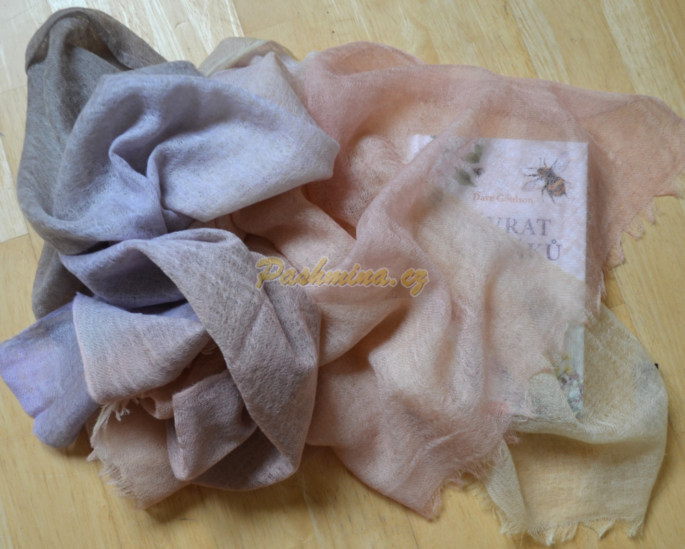 Originální šál z čistého kašmíru. Transparentní, vzdušně tkaný. Na kratších koncích ozdobený jemnými třásněmi typu "oční řasa"