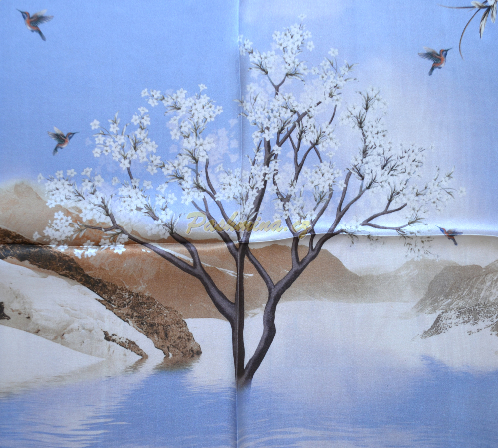 Jarní kvetoucí strom uprostřed řeky. Barevní ptáčci, kteří letí k dalším rozkvetlým stromům nasát čerstvý nektar dlouhými zobáčky. Bílé břehy a na pozadí stále zasněžené hory.