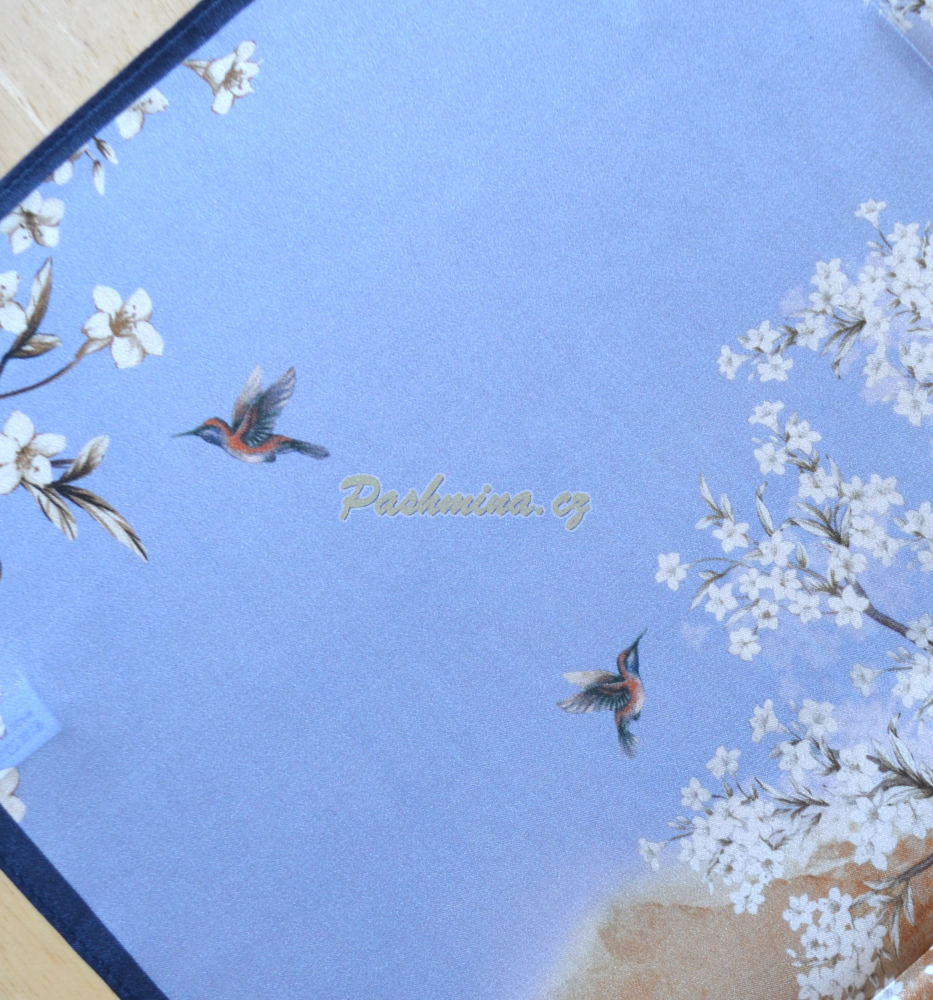 Příjemný šáteček z jemného, čistě hedvábného hladkého krepsaténu. Morušové hedvábí síly 12 m/m o váze pouhých 30 g. Tištěný vzor a okraje začištěné strojem.