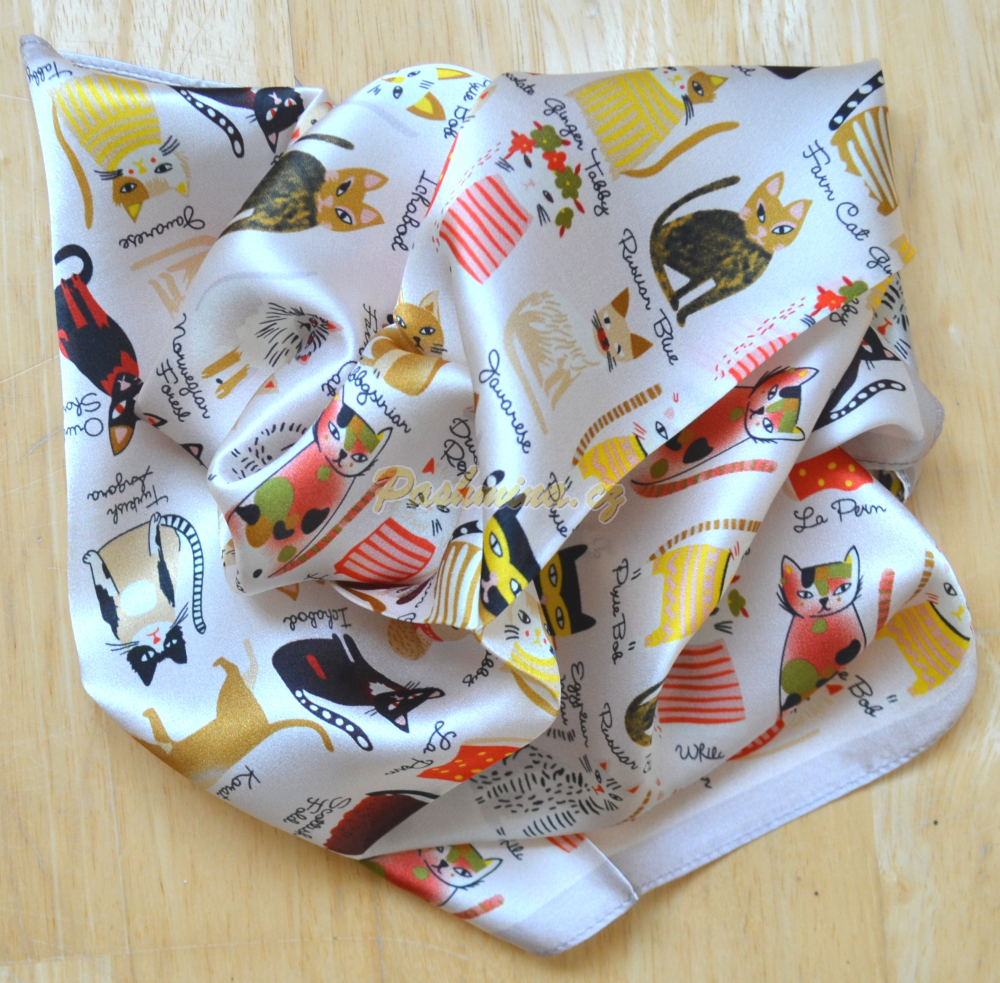 Příjemný šáteček z jemného, čistě hedvábného hladkého krepsaténu. Morušové hedvábí síly 12 m/m o váze pouhých 20 g, velmi subtilní kousek. Tištěný vzor a okraje začištěné strojem.