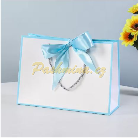 Velká taška z papíru. Bílá, zdobená pouze elegantním světle modrým proužkem po obvodu. S textilními, kroucenými stříbřitými uchy a zlatou saténovou mašlí na zavázání.