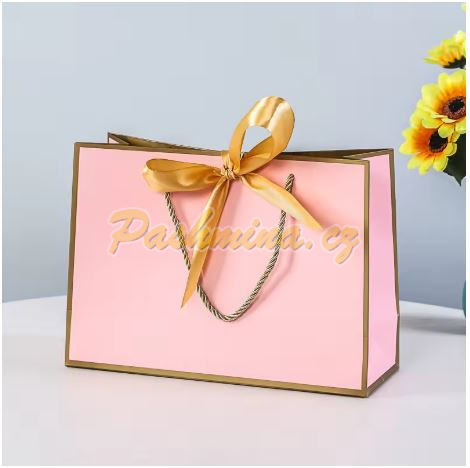 Velká taška z papíru. Růžová, zdobená pouze elegantním zlatým proužkem po obvodu. S textilními, kroucenými zlatavými uchy a zlatou saténovou mašlí na zavázání.
