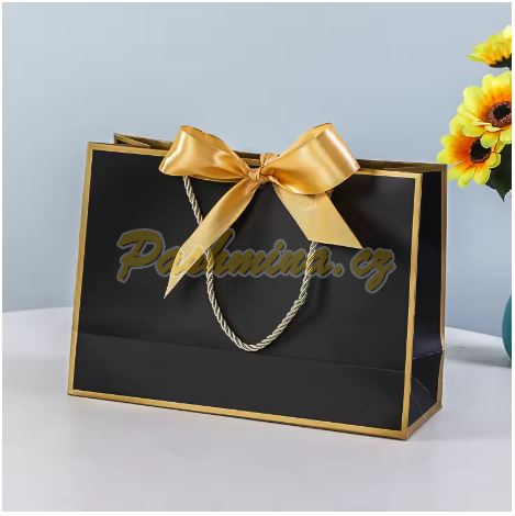 Velká taška z papíru. Černá, zdobená pouze elegantním starozlatým proužkem po obvodu. Se zlatavými textilními, kroucenými uchy a saténovou mašlí v barvě zlata na zavázání.