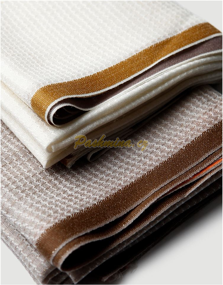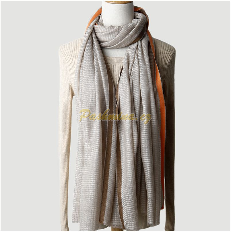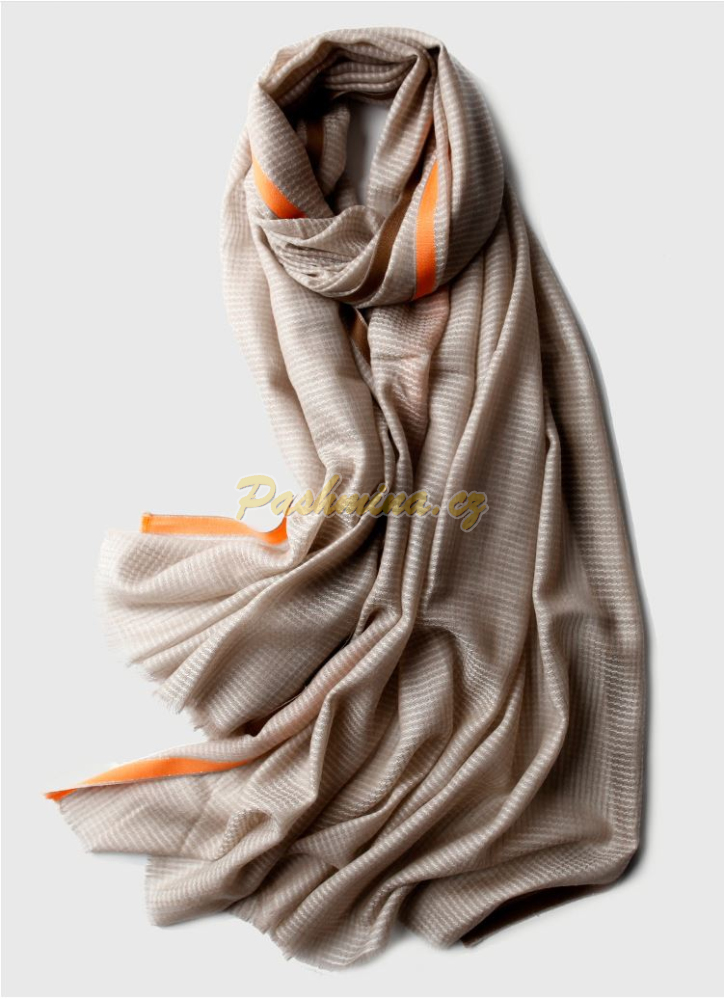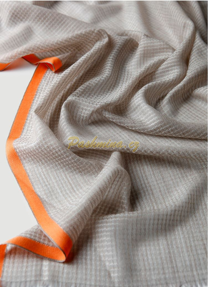 Světe béžový, protkávaný bílou napříč i podél, vypadá tak, že tvoří malé čtverečky. Po celé ploše je zatkané slaboulinké stříbrné vlákno, které dodává šálu jemný lesk. Krajové pruhy jsou hnědý a oranžový.