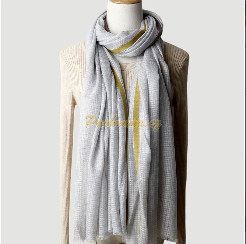 Šál z čisté vlny (lamb wool) s třásněmi ve stylu "oční řasy" na kratších koncích a barevným úzkým pruhem po delších krajích. Jemná, až transparentní, plasticky tkaná tkanina, váha úžasných 100 g. Příjemný, měkký.
