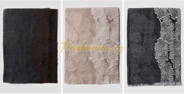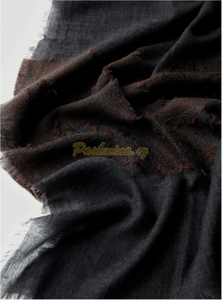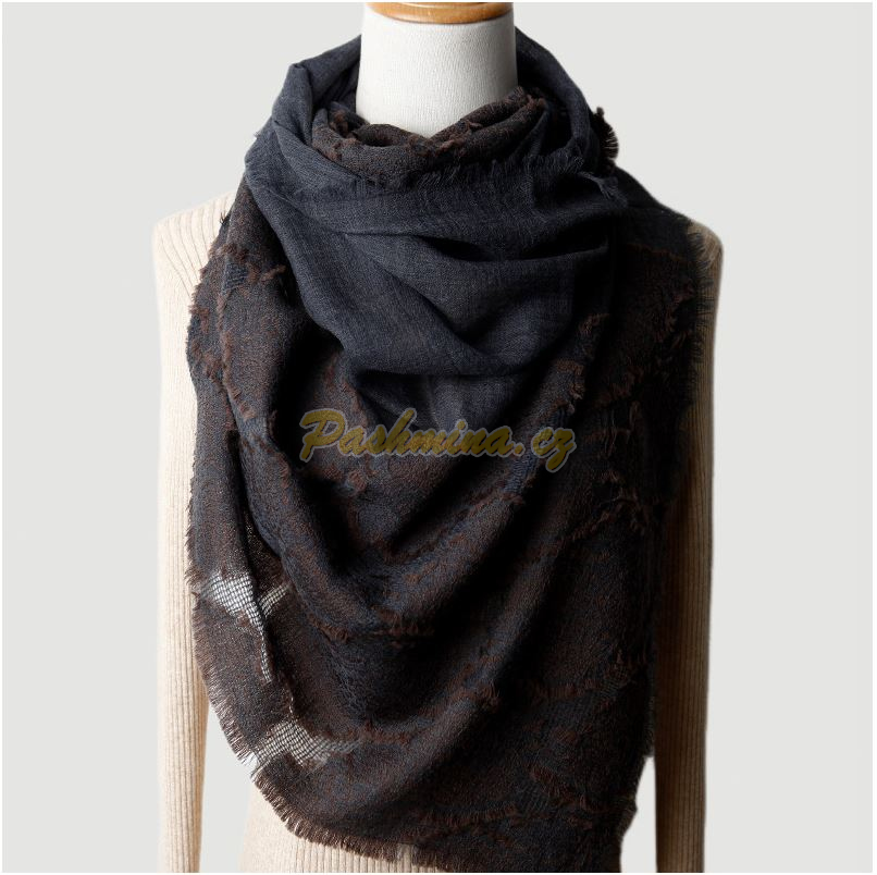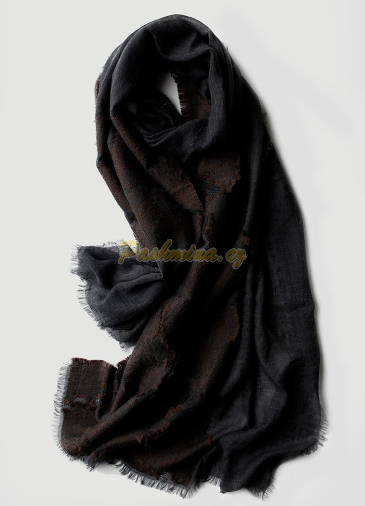 Šál z čisté vlny (lamb wool) s třásněmi ve stylu "oční řasy" po celém obvodu. Jemná, až transparentní, plasticky protkaná tkanina, váha úžasných 85 g! Příjemný, měkký.